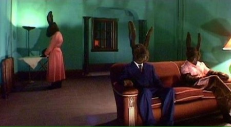 It’s been admitted by Lynch that he began this movie as an experiment and over the period of three years he would film certain scenes and images before constructing a narrative. Shooting began when he didn’t have a script in place but the more he shot, the more the film grew and his ideas merged into something. Many, if not all, viewers will still wonder what he has came up with as this is a film that’s so abstract and surreal that it could easily be written off as self-indulgent and pretentious. You could also say, that certain scenes and events don’t make sense at all and Lynch is throwing what he can at the screen just to see what sticks. There’s no doubt that it’s a difficult film to determine meaning from but I also find it difficult to accept that it’s accidental. There’s a spiritual and existential angle to the film which may or may not be about our main character being in a state of purgatory and going through some form of spiritual cleansing. There’s a central theme that can just about be grasped but trying to make sense of the Rabbits sitcom (with out-of-synch laugh tracks), the prostitutes dancing The Locomotion or crazy clown faces are just some of the more bizarre inclusions.